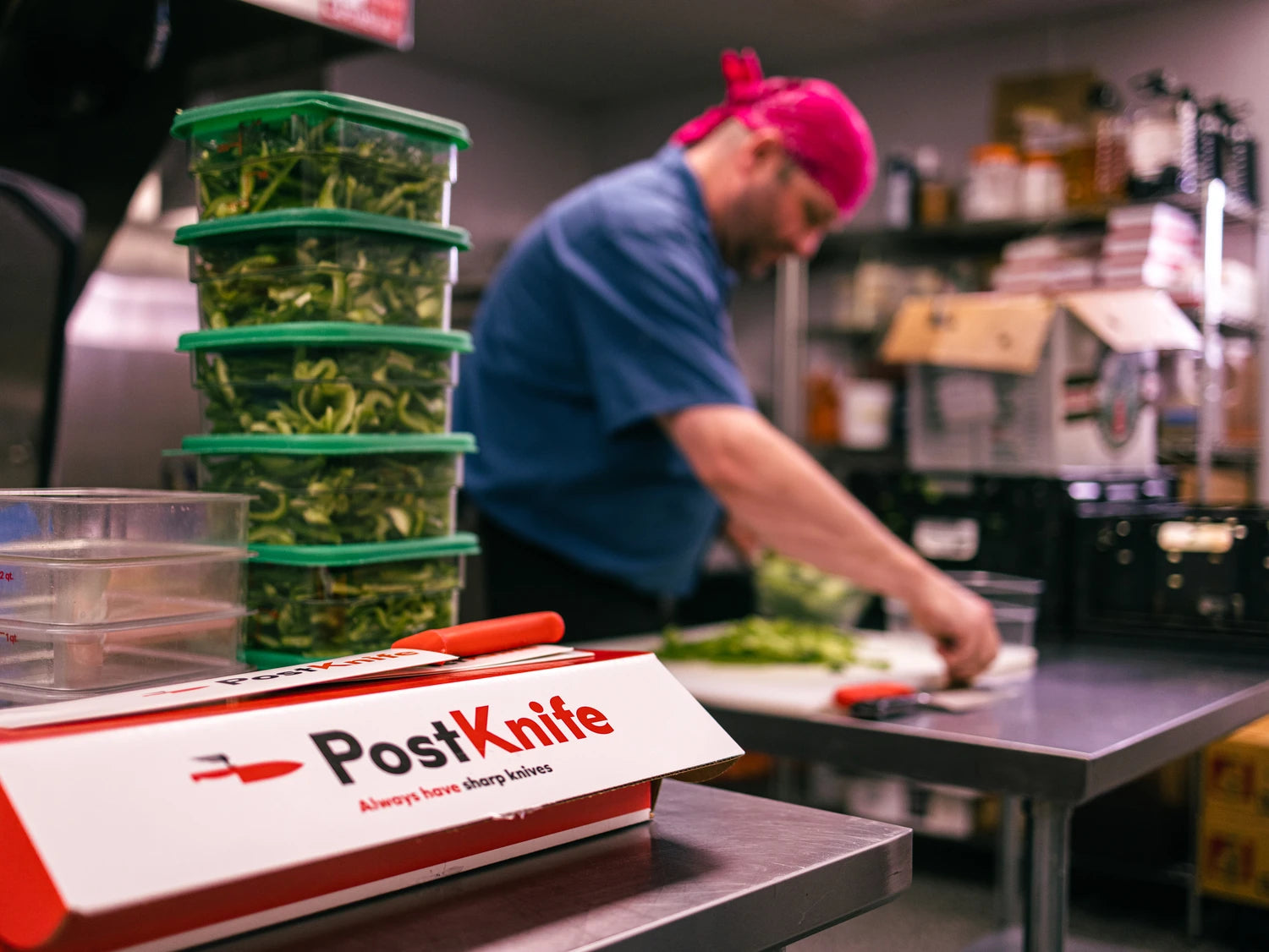 PostKnife works differently. You get two complete sets of professional knives – one working in your kitchen, one being professionally sharpened. We swap them on your schedule, shipping included. No downtime. No dull knives. Easy.